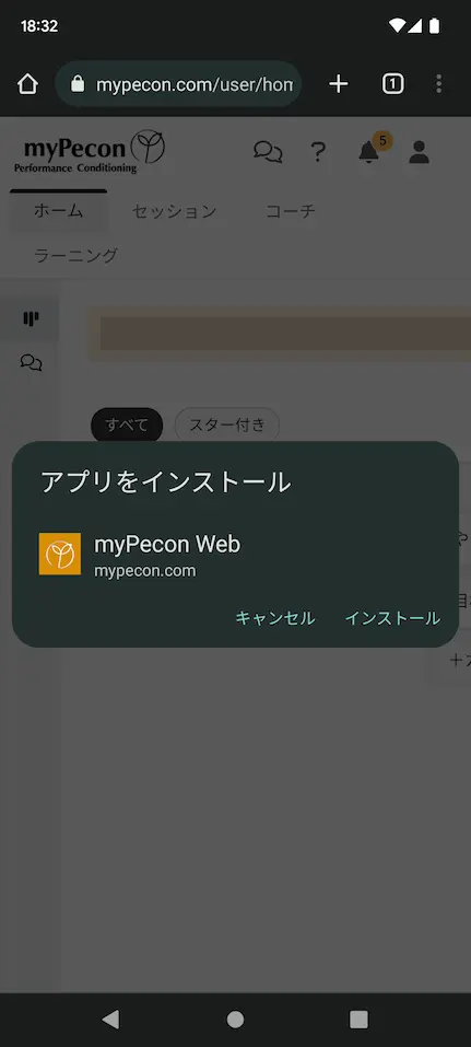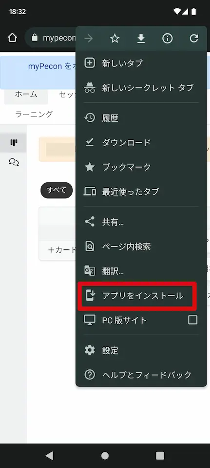 ログインした直後の画面で、画面右上のドットが 縦に 3 つ並んだアイコンをタップしてメニューを表示して、「アプリをインストール」をタップします。