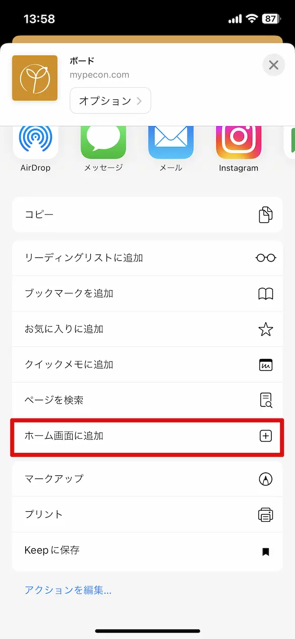 共有メニューが表示されるので、「ホーム画面に追加」をタップします。